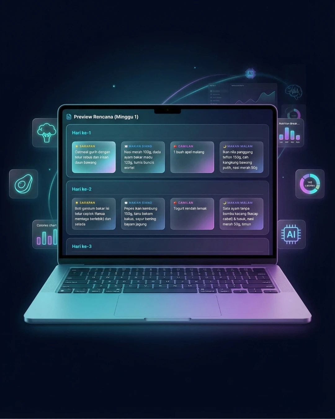 AI akan generate meal plan lengkap selama 30 hari sesuai targetmu. Mulai dari sarapan sampai makan malam, semuanya sudah disusun.