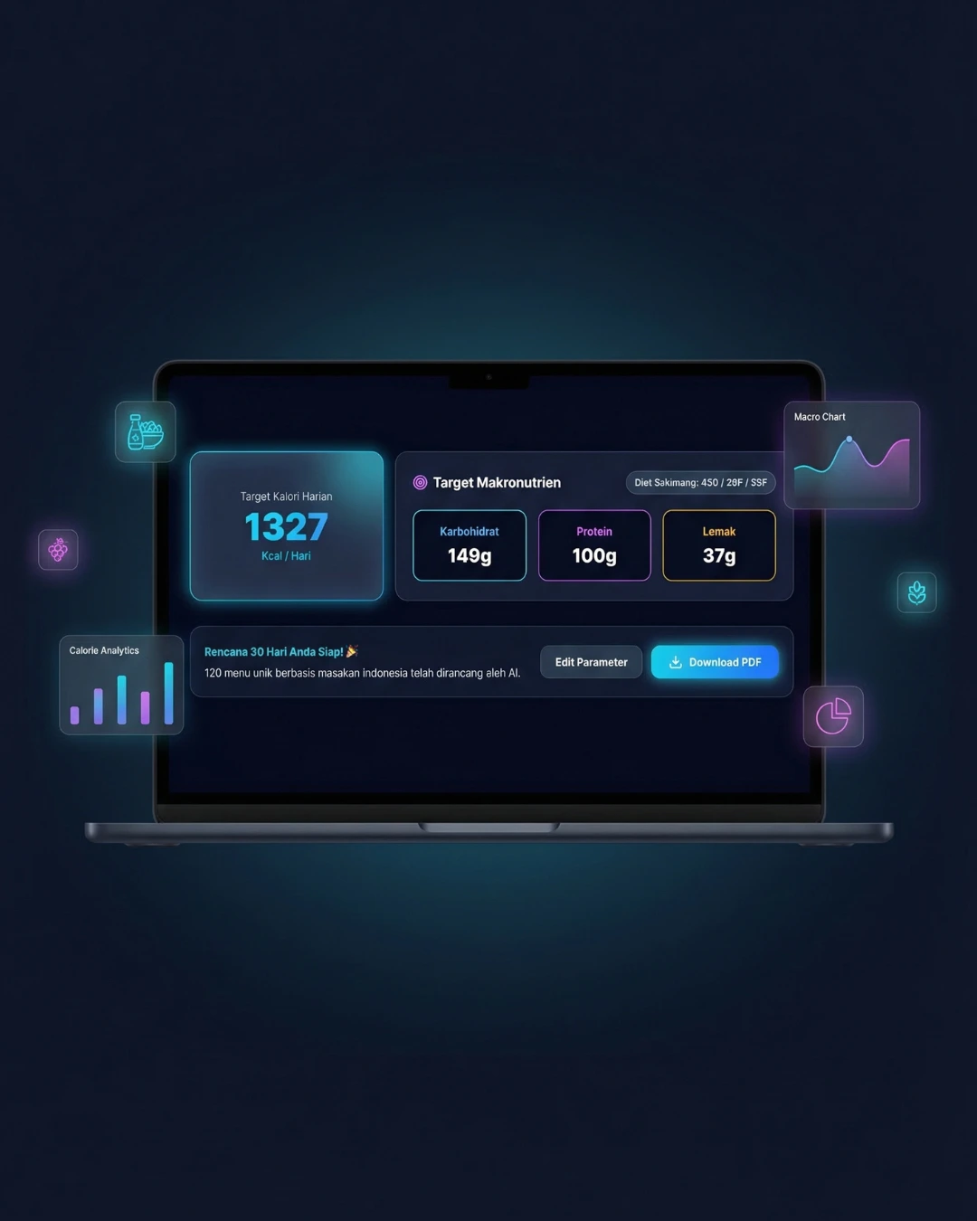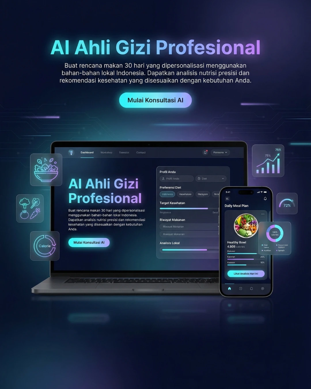 FITUR LENGKAP : Analisa berat badan dan summary nya, Kebutuhan Kalori harian, Mealplan 30 hari, AI Nutriscan untuk scanning kalori makanan harianmu