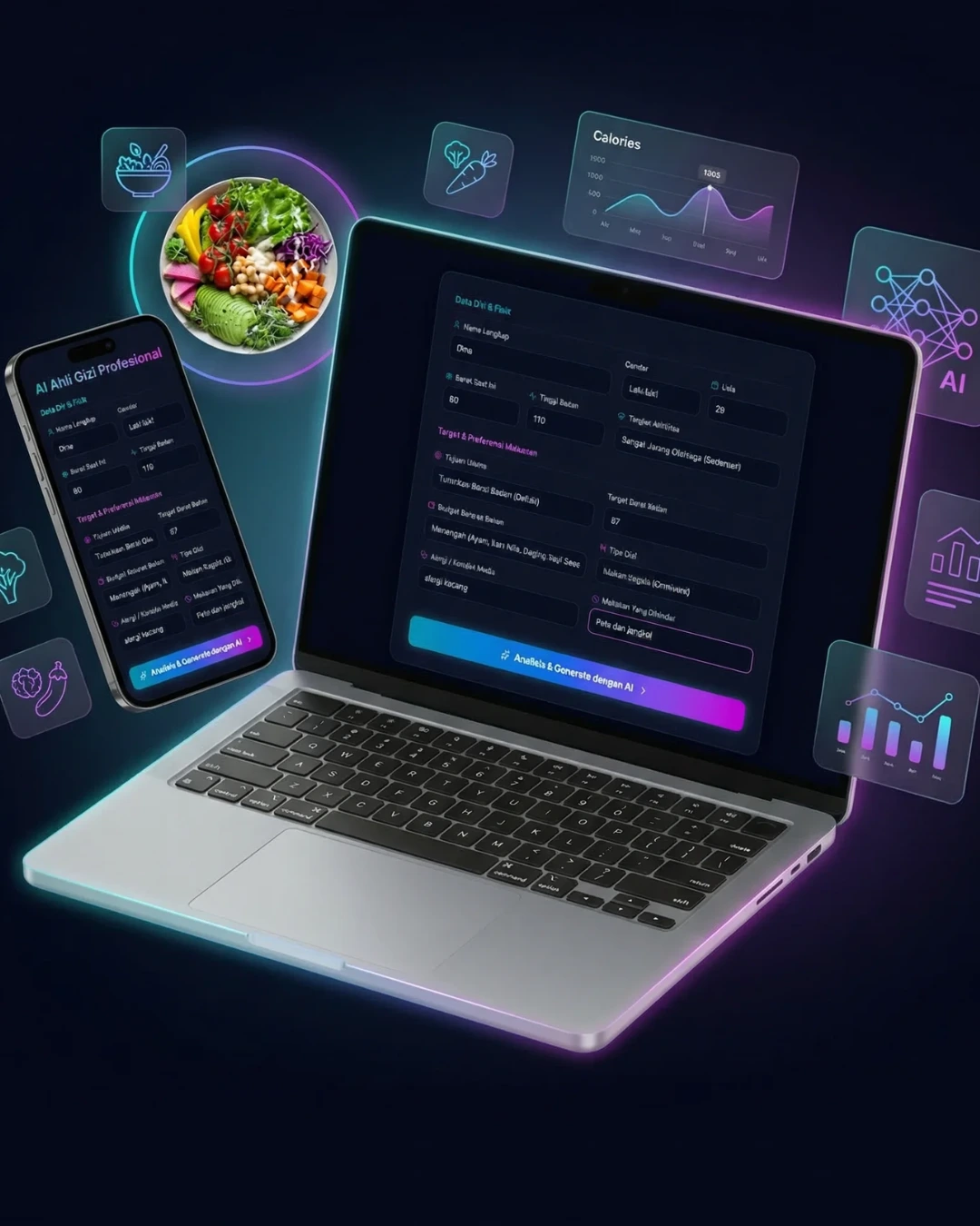 Cukup isi data dasar seperti berat badan, tinggi, aktivitas harian, dan target kamu. AI akan memahami kondisi tubuhmu secara personal.